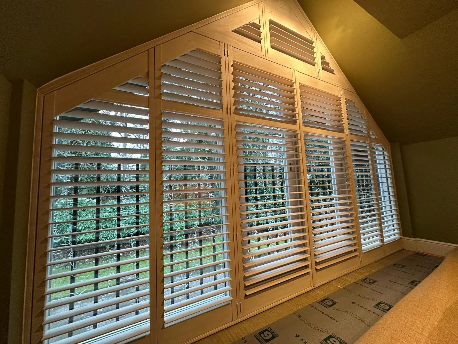 A striking bedroom feature has been completely reimagined. The large, triangular windows, once hidden behind dull, heavy curtains, now shine with bespoke shutters designed to fit their unique shape. The transformation floods the room with light, opens up the space, and brings a crisp, elegant finish—proving that the right window treatment can completely redefine a room.